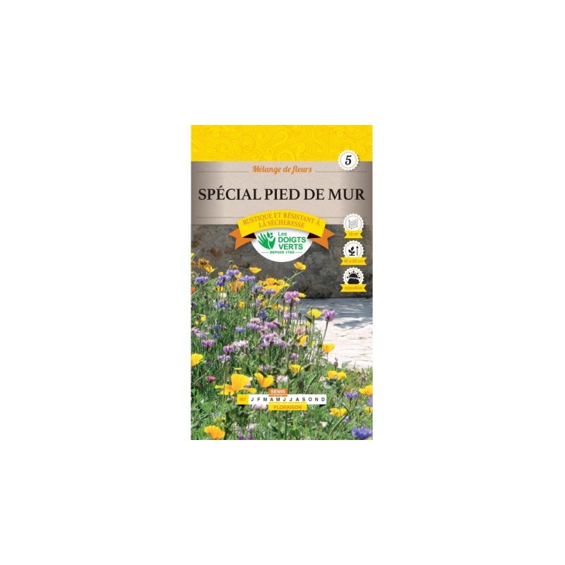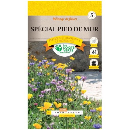 Le mélange de fleurs "Pied de mur" est composé de variétés basses, annuelles et vivaces, atteignant entre 40 et 50 cm de hauteur.