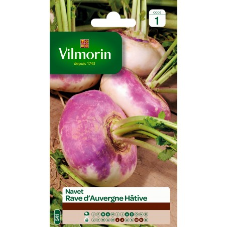 Navet rave d'Auvergne hâtif VILMORIN. Très cultivé dans le Sud-Est de la France, le navet rave d'Auvergne hâtif est une variété productive à gros rendement. Ses racines de couleur blanche à collet rose-violet, légèrement aplaties en forme de toupie, se développent rapidement. Récoltés jeunes (15 cm de diamètre environ), ils sont d'une saveur fine et douce. A complet développement, les racines deviennent énormes et sont plus adaptées à la nourriture animale. Idéal pour réaliser un semis d'automne en raison de sa précocité.
