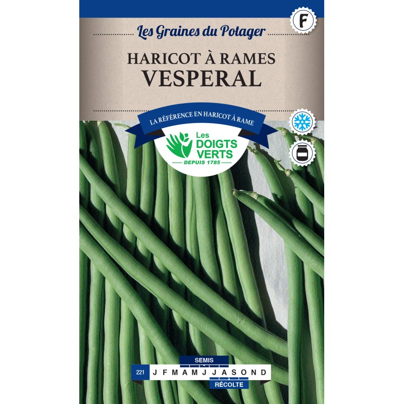 Le haricot à rames Vespéral est une variété de type filet, sans fil, vigoureuse et précoce. Il nécessite un tuteurage afin que ses vrilles puissent s’accrocher à un grillage ou à des branches ramifiées. Résistant à la chaleur, au virus 1 et à l’anthracnose, il produit des gousses fines, droites et rondes, de couleur vert foncé, mesurant entre 16 et 18 cm.