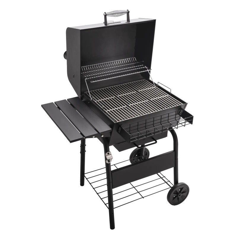 Large tablette pour un maximum d'espace et de praticité :  La tablette latérale est munie de crochets pour garder vos accessoires à portée de main, la tablette inférieure vous offre également une surface de travail et de rangement supplémentaire. Le Charcoal L est doté d'une tablette frontale supplémentaire facilement accessible.