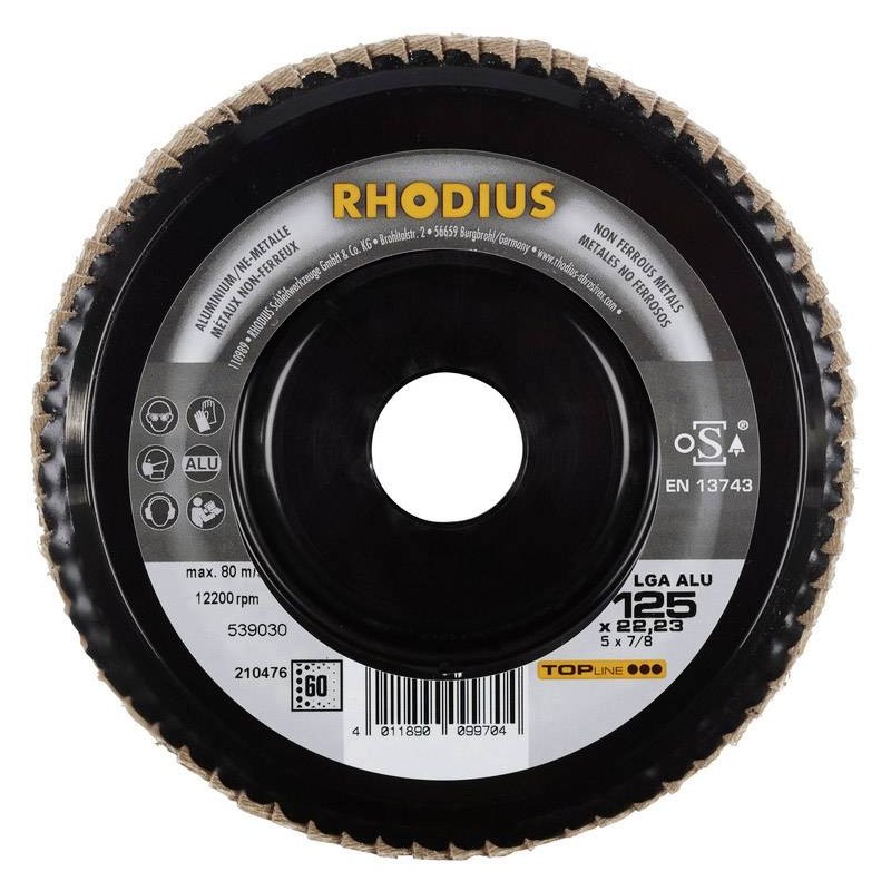 Ce disque a été conçu conformément à la norme EN 13743, satisfait aux exigences de sécurité et est homologué par l’oSA. Le plateau support spécial est fabriqué en ABS. Ce disque peut sans aucun problème être ajusté. En d’autres termes, les lamelles à débord s’usant au fil du temps peuvent être meulées, permettant de continuer à utiliser pleinement la surface de meulage encore intacte. Le LGA ALU utilise de l’oxyde d’aluminium (corindon) de qualité comme grain abrasif. Celui-ci est auto-affûtant. Tous les disques à lamelles RHODIUS ne contiennent en outre ni fer, ni soufre. Les lamelles de ce disque sont plates. Lorsqu'un meulage plan est requis, cet agencement plat des lamelles facilite tout particulièrement le travail. Dimensions : 125 x 22.23