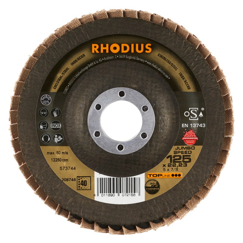 Ce disque a été conçu conformément à la norme EN 13743, satisfait aux exigences de sécurité et est homologué par l’oSA. Il est doté d’un plateau support en fibres de verre. Son utilisateur peut travailler en exerçant de fortes pressions sur sa machine. Le JUMBO SPEED EXTENDED utilise un grain céramique de qualité (corindon fritté) comme grain abrasif. Celui-ci est auto-affûtant. Tous les disques à lamelles RHODIUS ne contiennent en outre ni fer, ni soufre. Les lamelles sont placées de manière conique sur ce disque. Le positionnement conique des lamelles à 10° améliore l’ergonomie pendant le meulage et facilite ainsi la manipulation. Le JUMBO SPEED EXTENDED convainc par sa durée de vie élevée et un enlèvement extrêmement agressif et se caractérise par une durée de vie très longue. Le « revêtement Top Size » spécifique des lamelles garantit dans un même temps un meulage quasiment sans échauffement. Cet outil de pointe convient parfaitement pour les travaux de meulage exigeants et présente un rapport qualité-prix exceptionnel. Dans la pratique, le disque à lamelles JUMBO SPEED EXTENDED se caractérise par ses longues lamelles superposées. Celles-ci garantissent un réel plus en terme de performances et un enlèvement agressif. Dimensions : 125 x 22.23