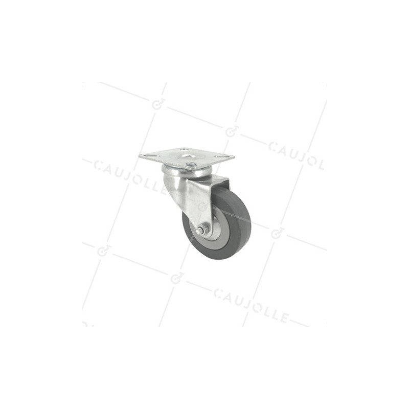 Roulette sur monture pivotante à platine. Le bandage du galet est en caoutchouc non tachant.