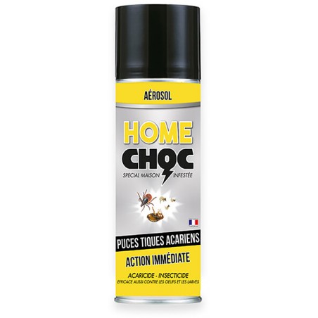 5- Réutiliser Home Choc dès réapparition des insectes. Dangereux pour le chat. Dangereux pour les animaux à sang froid et les poissons. Suite à la pulvérisation, laver tapis, fauteuils et autres matériaux susceptibles d’être en contact avec l’homme et animaux. Produit allergisant.