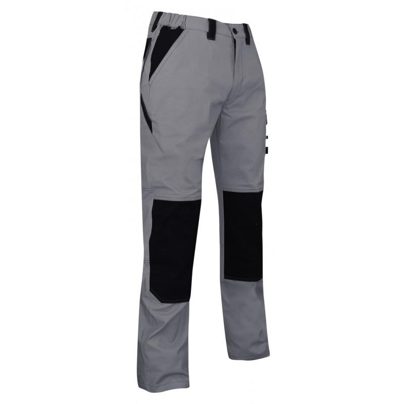 Pantalon bicolore avec poches genouillères : Ceinture élastiquée côtés - braguette zip spirale - 2 poches italiennes - système porte-outils sur la cuisse gauche - poches genouillères - au dos : 1 poche à rabat fermé par auto-agrippant - 1 poche téléphone - 1 poche mètre - empiècements contrastants - triple piqûre- points d’arrêt rouges