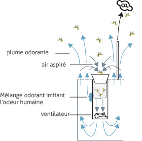 À l'intérieur du piège se trouve un sachet odorant qui enrichit le flux d'air sortant avec de petites quantités de substances naturellement présentes sur la peau humaine.