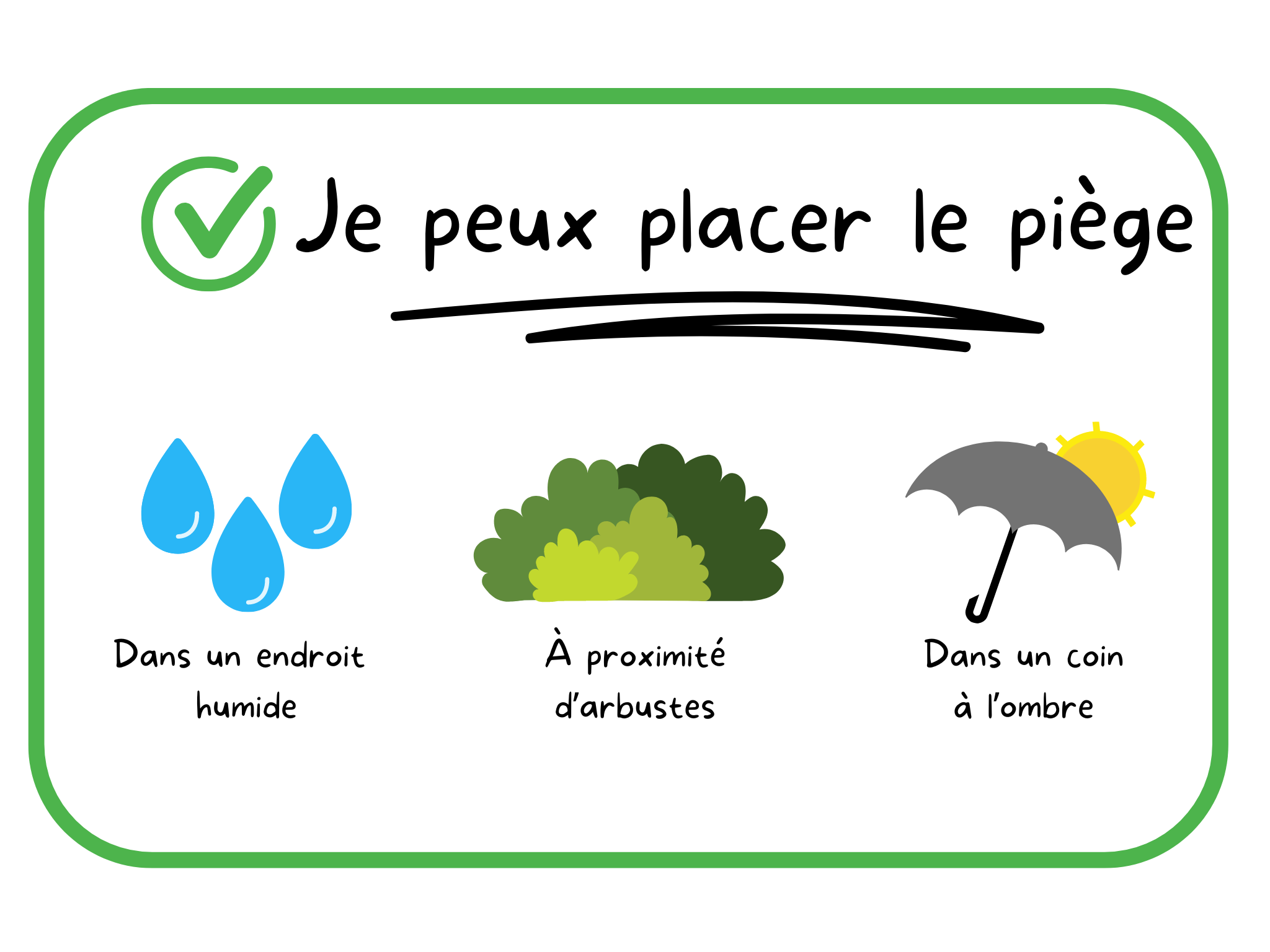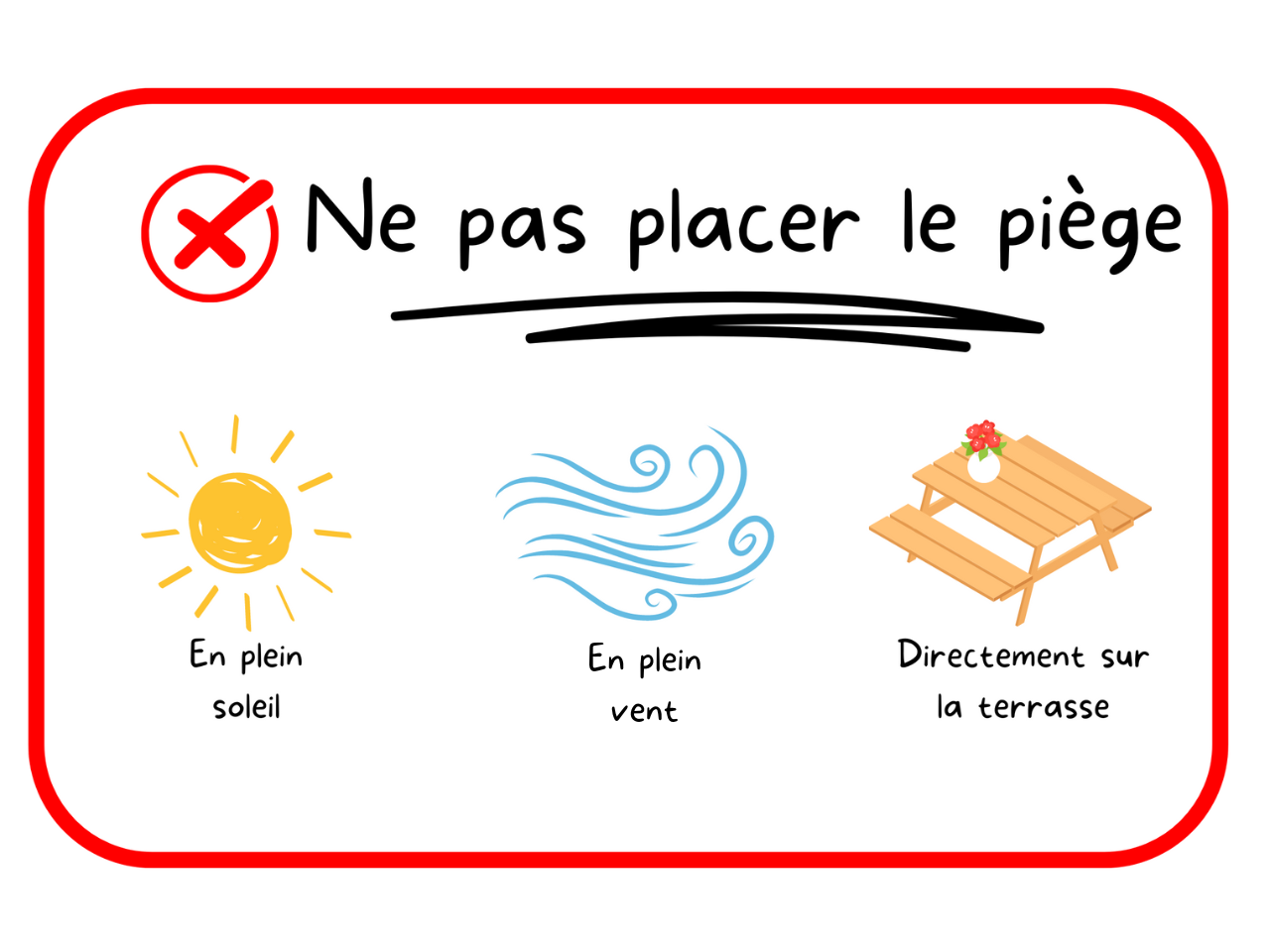 Il est recommandé de positionner le piège à proximité des zones de repos et de reproduction des moustiques. De cette manière, ces derniers seront attirés par le piège avant d'atteindre votre terrasse.