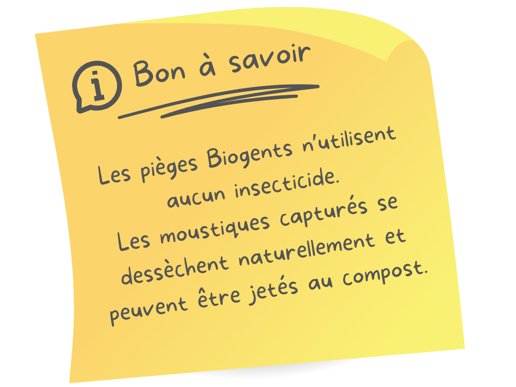 Comparé au piège BG-Mosquitaire, le BG-GAT capture des moustiques à un stade de développement différent : ces moustiques ont déjà piqué et cherchent un endroit où pondre leurs œufs.