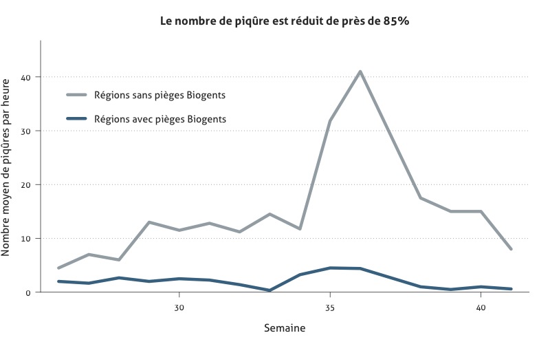 Après seulement quelques jours de test, une réduction du nombre de piqûres a été observée dans les jardins équipés de pièges Biogents. Pendant la saison, cette réduction peut atteindre jusqu'à 85 % dans les jardins équipés, par rapport à ceux non équipés, et ce, sans recours aux insecticides.
