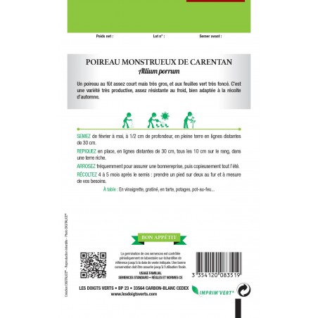 Le Poireau Monstrueux de Carentan est un poireau au fût assez court mais très gros, et aux feuilles vert très foncé. C’est une variété très productive, assez résistante au froid, bien adaptée à la récolte d’automne.