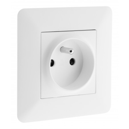 Prise 2P+T simple 16A. Puissance maximum 3680W sous 230V. Installation encastrée sur tout type de boîte d'encastrement grâce au moteur très compact. Support clipsable et réglage millimétrique avec rattrapage du jeu. Format de la plaque de finition: 86 x 86 (mm). Certifié conforme à la norme NF.