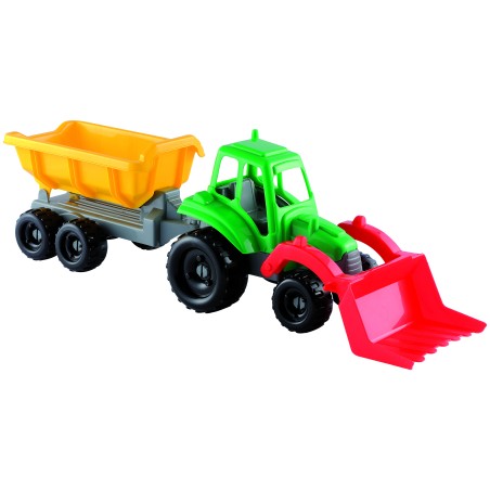 Un tracteur de fermier avec une remorque et une pelle à l'avant. Fabrication Française.