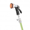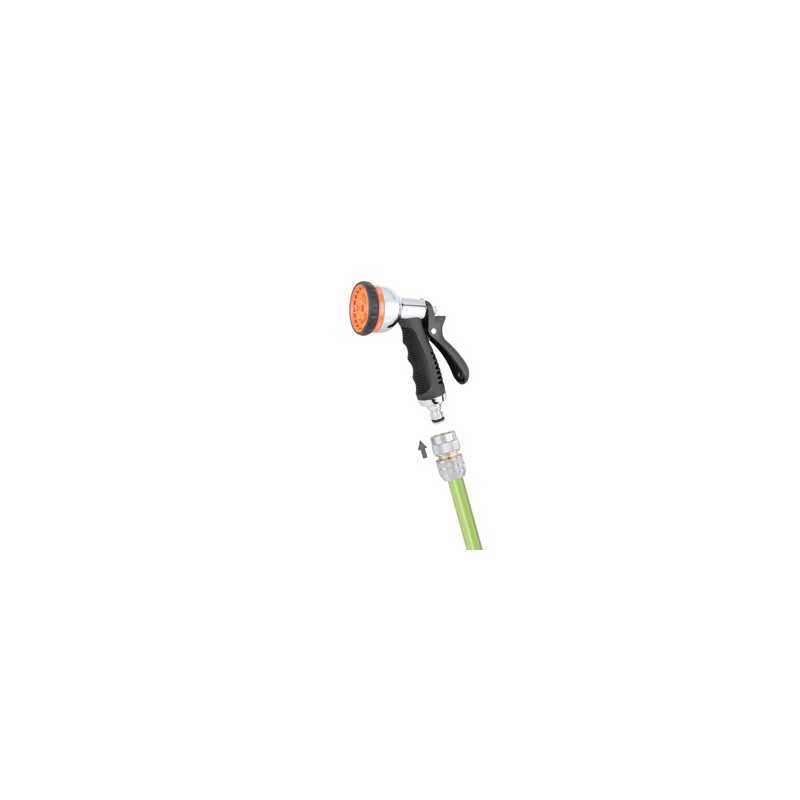 Pistolet multifonctions en métal. Poignée ergonomique en caoutchouc. Levier de réglage du flux d’eau et dispositif de fixation du jet souhaité. En tournant la bague, on obtient 8 jets différents. Raccord Quick-Click.