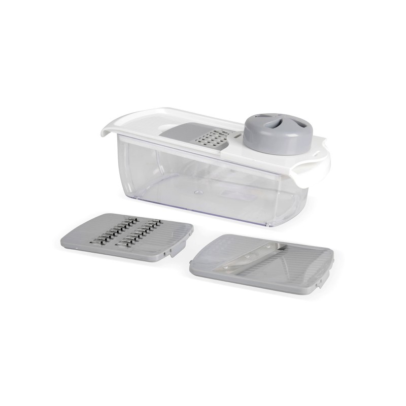 Avec 3 lames interchangeables inox : 1 lame julienne, 1 lame râpe et 1 lame tranche. Avec 1 protège doigts, 1 réservoir plastique, 1 base anti-dérapante