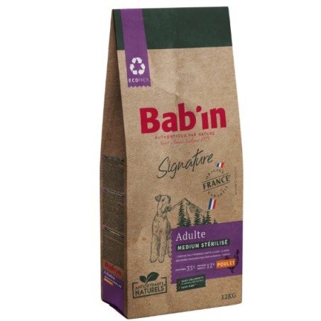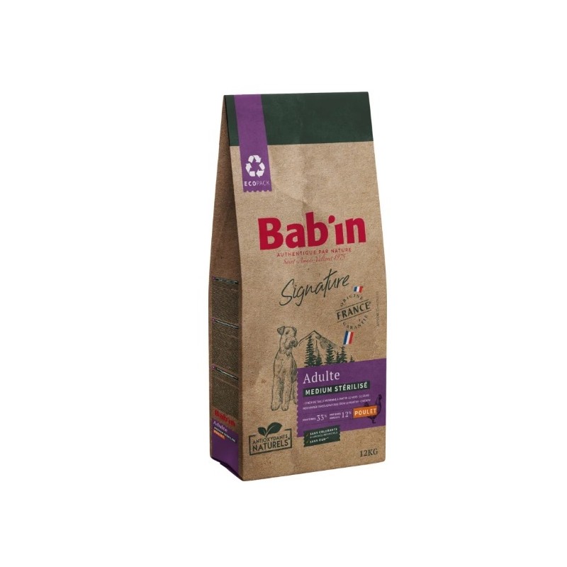 BAB’IN MEDIUM STÉRILISÉ aide à maintenir un poids optimal chez les chiens stérilisés de taille moyenne grâce à une teneur élevée en protéines (33%), un apport modéré en matières grasses (12%) et un rationnement adapté. Le complexe de glucosamine et chondroïtine favorise le soutien articulaire (750 mg/kg).