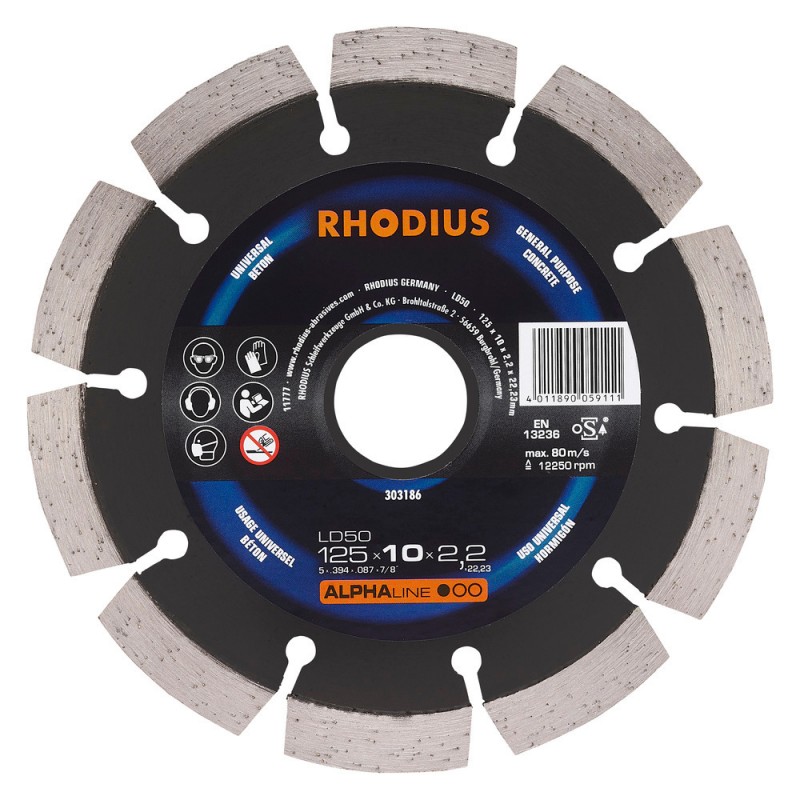 Le LD50 a un tranchant segmenté. De cette manière, une vitesse de coupe très élevée est atteinte avec une durée de vie maximale en même temps. L'outil est testé selon la norme EN13236 et peut être utilisé pour la coupe humide et sèche. Grâce aux diamants industriels de haute qualité, le LD50 est particulièrement puissant. Dimensions : 125 x 10.0 x 2.2 x 22.23
