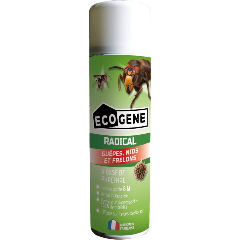 Pour éradiquer les nids de guêpes et les nids de frelons, votre droguerie vous propose dans sa gamme d'insecticides l'aérosol longue portée et foudroyant spécial nids de guêpes Ecogène dans son format de 500 ml.