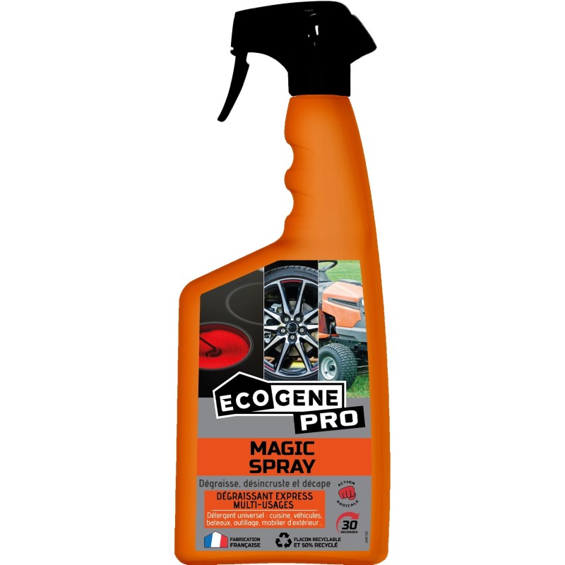 Grace à sa formule optimisée, MAGIC SPRAY est le détergent universel pour nettoyer MAISON, VEHICULES, BATEAUX, MATERIEL DE JARDIN ET DE BRICOLAGE, MATERIEL PROFESSIONNEL… Sa formule MULTI-USAGES et HYPERACTIVE, permet de remplacer les nombreux produits ménagers commercialisés pour leurs actions spécifiques, MAGIC SPRAY évite ainsi le stockage longue durée de ces produits, qui les rendent inactifs, ainsi que l’encombrement de vos placards. Le pouvoir nettoyant et dégraissant étonnant de MAGIC SPRAY favorise l’élimination des salissures générées par les corps gras, sans efforts.