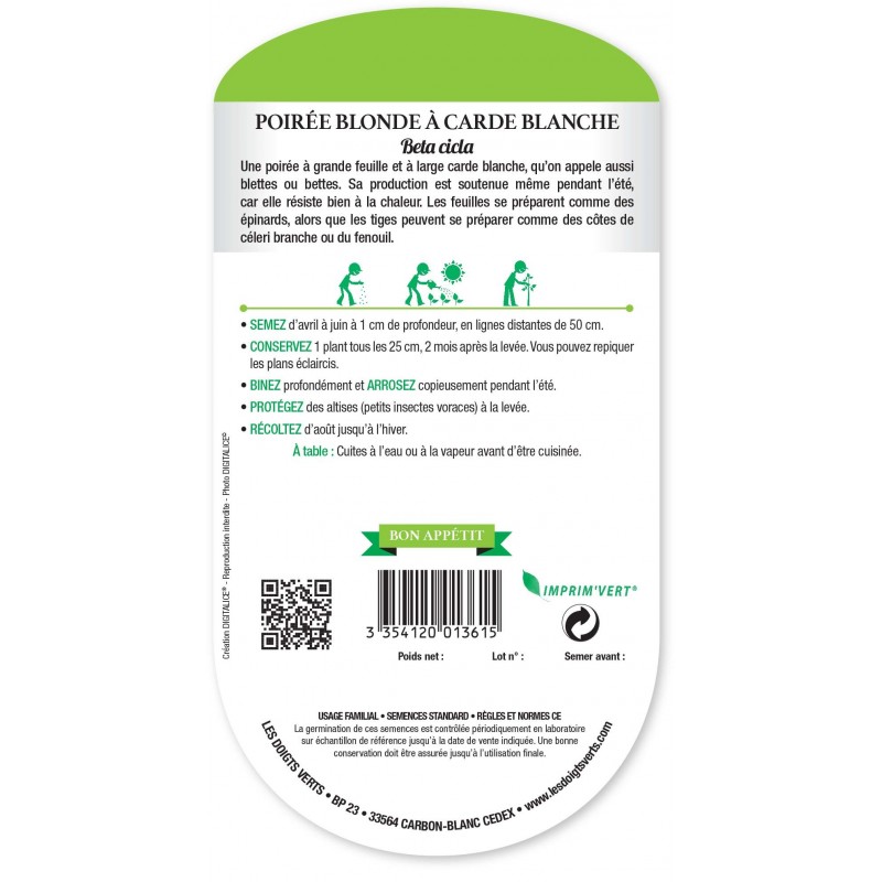 Une poirée à grande feuille et à large carde blanche, qu’on appelle aussi blettes ou bettes. Sa production est soutenue même pendant l’été, car elle résiste bien à la chaleur. Les feuilles se préparent comme des épinards, alors que les tiges peuvent se préparer comme des côtes de céleri branche ou du fenouil.
