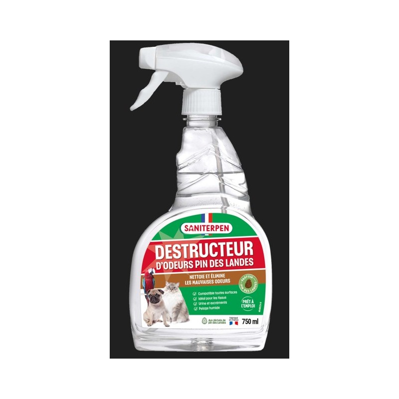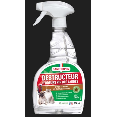 SANITERPEN Destructeur d'Odeurs Pin des Landes éradique les mauvaises odeurs des animaux de compagnie (déjections, marquage du territoire, odeurs sexuelles, pelage humide ou mouillé) tout en laissant une odeur fraîche et durable de Pin des Landes.