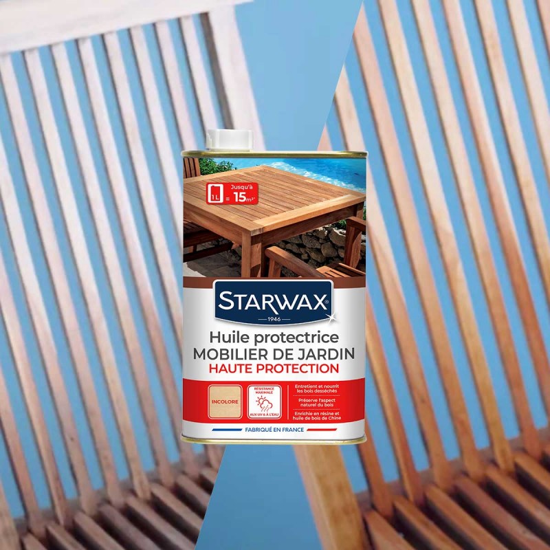 L’Huile protectrice teck et bois exotiques de Starwax est un véritable outil de soin pour les salons de jardin en bois. Elle permet de protéger le mobilier de jardin en bois contre les intempéries, les taches et les graisses.