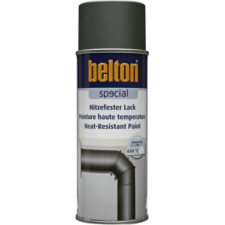 Bombe de Peinture aérosol Belton hautes températures. Conçue pour résister à des températures jusqu'à 650°C. Idéal pour la mise en peinture d'éléments soumis à fortes températures comme les conduits de poêles et chaudières, inserts et cheminées ou pots d'échappement de véhicules.