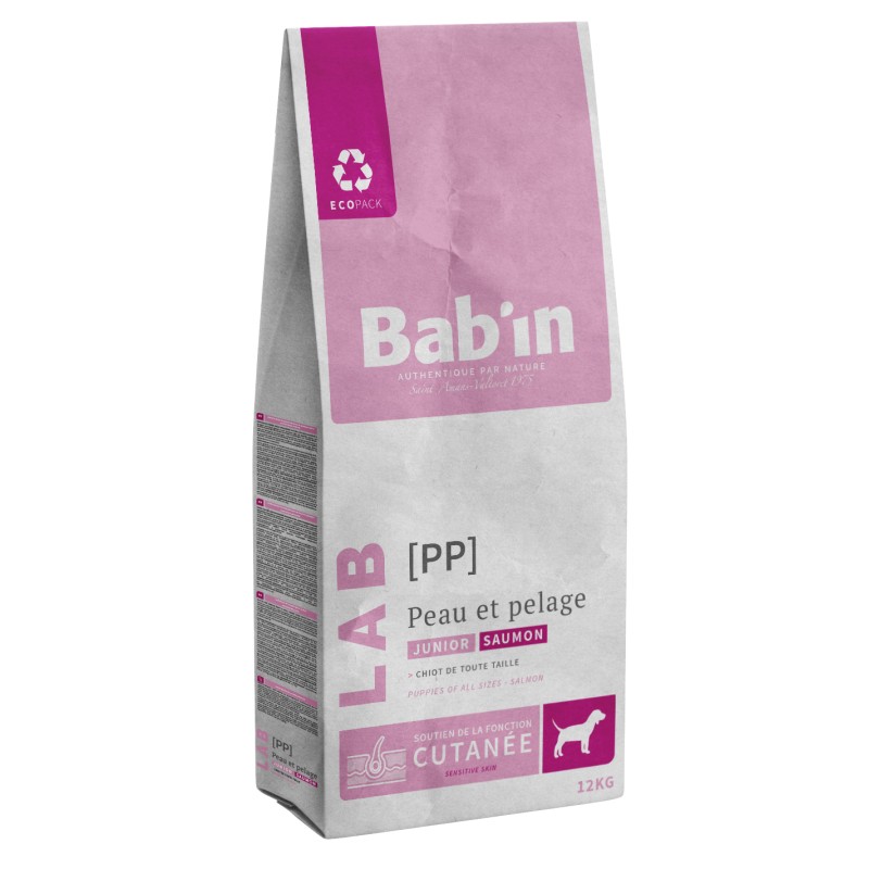 BAB’IN LAB JUNIOR PEAU & PELAGE favorise une peau saine et un pelage brillant grâce à son taux élevé de saumon (26%), de céréales hypoallergéniques (20% de riz) et d’oméga 3&6. Complété par des graines de bourrache, de la levure de bière (vitamine B) et de la méthionine (acides aminés soufrés), il est un aliment de choix pour les chiots ayant une sensibilité cutanée. Il contribue à une digestion optimale et favorise le soutien articulaire grâce à son complexe de glucosamine et chondroïtine.