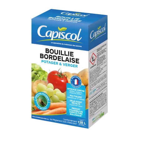 La Bouillie Bordelaise Potager et Verger Solabiol est un fongicide préventif et curatif de contact à base de sulfate de cuivre dont les vertus sont reconnues depuis longtemps et utilisable en jardinage biologique. La Bouillie Bordelaise est recommandée sur vigne, pomme de terre, légumes et arbres fruitiers.