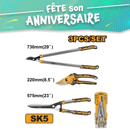 SET DE 3 OUTILS : SECATEUR 22CM TAILLE HAIE 56CM EBRANCHEUR 73CM - INGCO