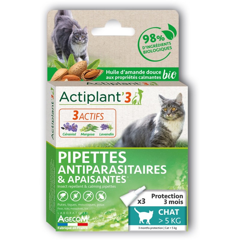 Les pipettes insectifuges et calmantes Actiplant’3 ont été spécialement formulées à partir de substances actives inspirées du monde végétal et reconnues pour leurs propriétés répulsives : Géraniol, Margosa, Lavandin. Chaque substance a une action spécifique sur les parasites externes (puces, tiques, moustiques et poux). La combinaison de ces principes actifs associés dans une même formule crée un véritable booster et permet une action renforcée sur les parasites. Riche en vitamines, en oligo-éléments, en agents antioxydants et grâce à ses propriétés apaisantes, l’huile d’amande douce nourrit et hydrate la peau et le poil de votre animal tout en calmant d’éventuelles démangeaisons.