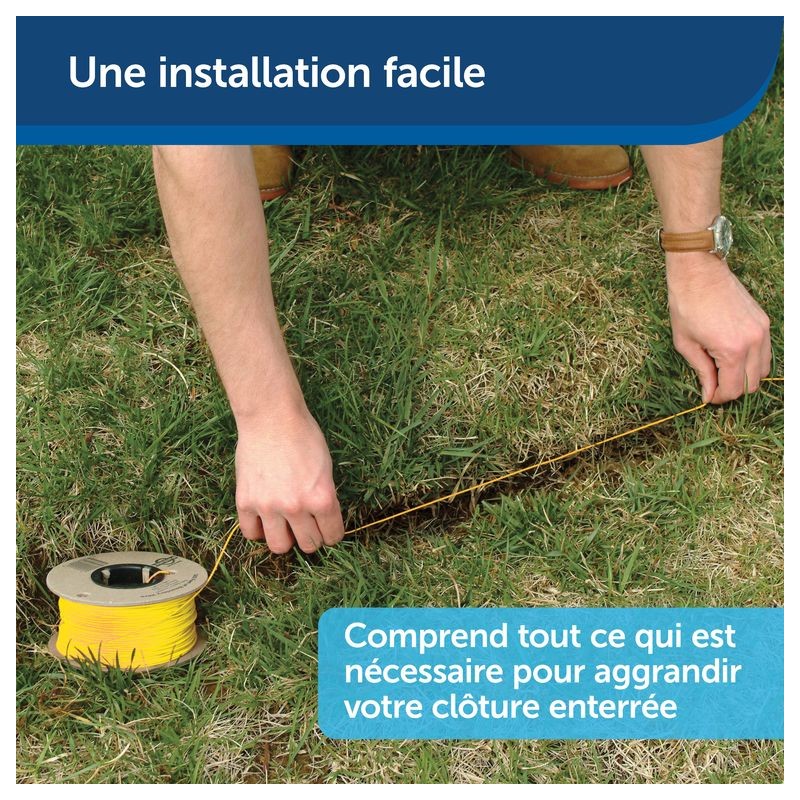 Le kit d’extension est composé d’une bobine de fil de 150m et de 50 fanions d’apprentissage, permettant d’augmenter le périmètre de base des systèmes anti fugue à fil. Attention, chaque système anti-fugue a une capacité propre d’extension. Se référer au manuel d’utilisation du système pour connaître la superficie maximum possible