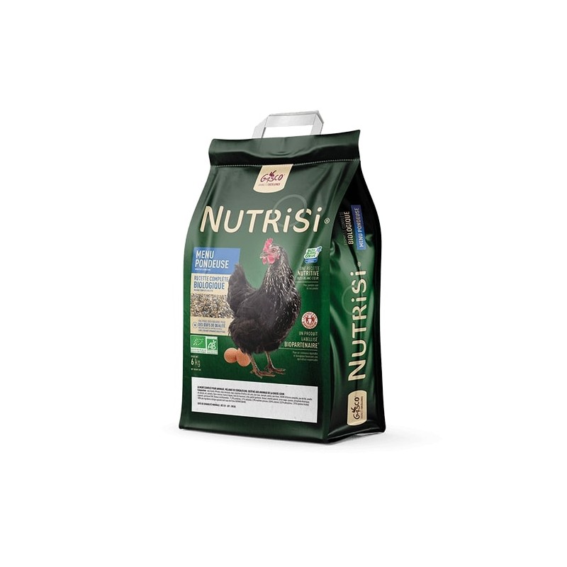 Aliment complet pour animaux - Labellisé Bleu Blanc Coeur, ce Nutrisi Menu Pondeuse Bio 6kg est fabriqué en France, dans le Gers ! Cette formule complète est enrichie en graines de lin. Les oeufs de vos poules seront bio et naturellement riches en oméga-3. Nul besoin d’être un spécialiste en basse-cour pour avoir des oeufs de qualité, des poules bien alimentées et heureuses. D’ailleurs, des nutritionnistes valident l’ensemble des recettes Nutrisi.