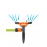 Arroseur statique à deux bras rotatifs avec buses orientables, et nouveau design. Il se plante à l’endroit où il sert, avec le piquet de forme spéciale, conçue pour garantir une stabilité maximale dans le terrain, et il arrose d’une pluie fine tout autour d’une zone circulaire. Raccord standard Quick-Click. Zone arrosée max. 64 m².