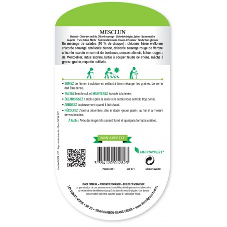 Un mélange de salades (10 % de chaque) : chicorée frisée wallone, chicorée sauvage améliorée blonde, chicorée sauvage rouge de Vérone, chicorée scarole en cornet de bordeaux, cresson alénois, laitue rougette de Montpellier, laitue sucrine, laitue à couper feuille de chêne, mâche à grosse graine, roquette cultivée.