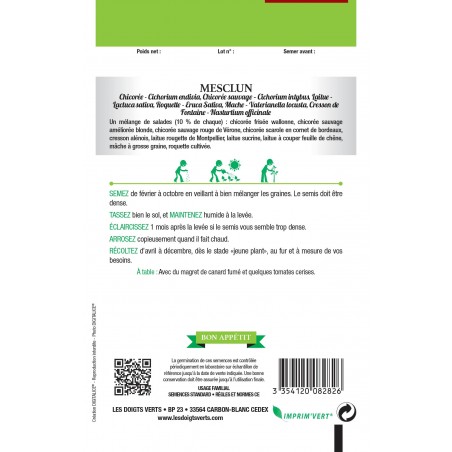 Le Mesclun est un mélange de salades (10 % de chaque) : chicorée frisée wallonne, chicorée sauvage améliorée blonde, chicorée sauvage rouge de Vérone, chicorée scarole en cornet de bordeaux, cresson alénois, laitue rougette de Montpellier, laitue sucrine, laitue à couper feuille de chêne, mâche à grosse graine, roquette cultivée.