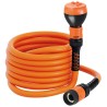 Tuyau extensible équipé. Avec le passage de l’eau, le tuyau s’étend jusqu’à doubler sa longueur (à la pression idéal de 3 bar - longueur max 25 m). Après l’utilisation, le tuyau se rétracte tout seul.
