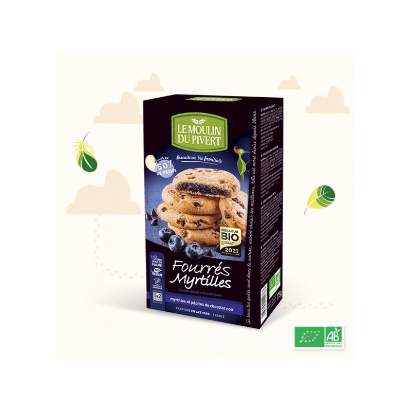 Laissez-vous surprendre par notre tendre Fourré aux myrtilles. Le secret de ces biscuits moelleux fourrés aux myrtilles, c’est le mélange savoureux d’une farine de blé moulue à la meunerie familiale de Montricoux (Tarn-et-Garonne) avec une huile de tournesol provenant du Sud-Ouest, de la purée de myrtille, de délicieuses pépites de chocolat du sucre de canne équitable non raffiné issu du commerce équitable, une pointe de jus de citron et quelques noisettes pour encore plus de goût.