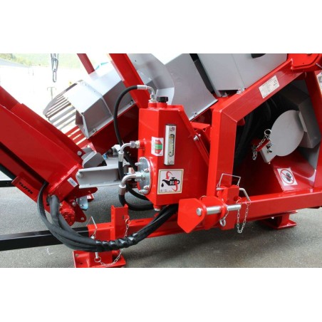 - Tapis hydraulique 5 mètres : télescopique en 3 parties, dépliage hydraulique en 2 temps, tension hydraulique de la bande, réglage manuel d'angle de la hauteur du tapis, orientation gauche droite hydraulique (+/-15°), vitesse d'évacuation variable, commande hydraulique marche avant / arrière