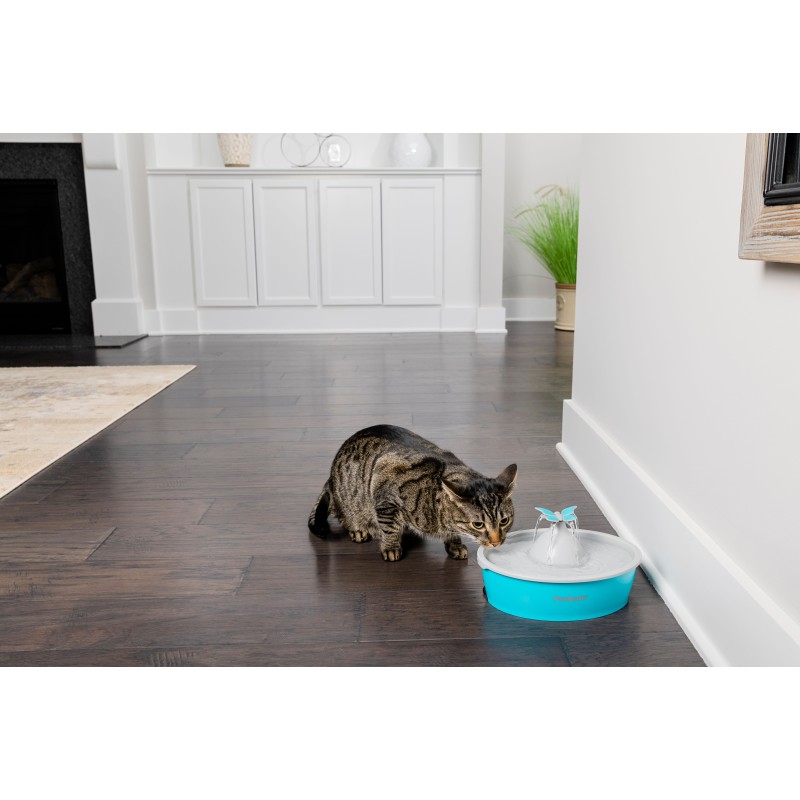La fontaine à eau Butterfly pour animaux de compagnie Drinkwell de PetSafe filtre et fait circuler l’eau de votre animal en permanence. Le papillon en option sur le dessus, produit quatre flux à écoulement libre et peut se retirer pour créer un flux silencieux et effervescent. La fontaine Butterfly a été spécialement fabriquée sans cavités difficiles d’accès pour le nettoyage, le plastique utilisé est certifié sans Bisphénol A pour garantir la sécurité des animaux. La fontaine est équipée d’une double filtration : le filtre en mousse capture les poils et autre saletés pour une eau plus pure ; le filtre au charbon actif élimine les mauvais goûts et les mauvaises odeurs..