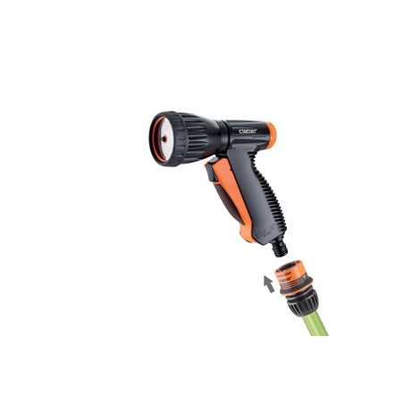 Pistolet multifonction avec nouvelle poignée anatomique caoutchoutée et mécanisme commode antérieur à bouton pratique pour l’ouverture et la fermeture du débit. Manette arrière de réglage du débit d’eau. Bague caoutchoutée avec fonction antichoc, ouvrante pour inspection et nettoyage. En tournant la bague on obtient quatre jets différents: douche, concentré, diffusé en éventail ou nébulisé.