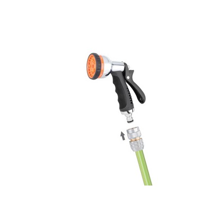 Pistolet multifonctions en métal. Poignée ergonomique en caoutchouc. Levier de réglage du flux d’eau et dispositif de fixation du jet souhaité. En tournant la bague, on obtient 8 jets différents. Raccord Quick-Click.
