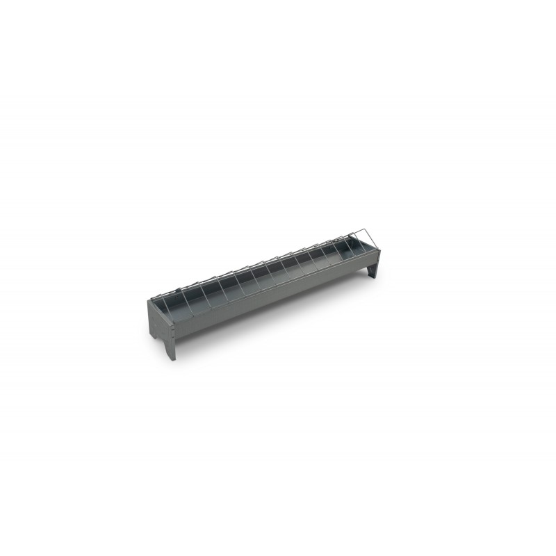Mangeoire linéaire galvanisée pour poulets. La grille anti-gaspillage est assemblée par une charnière sur un côté afin de faciliter l’ouverture pour le nettoyage et le remplissage, sa forme empêche la nidation. Les animaux peuvent manger sur les deux côtés dans 14 compartiments.