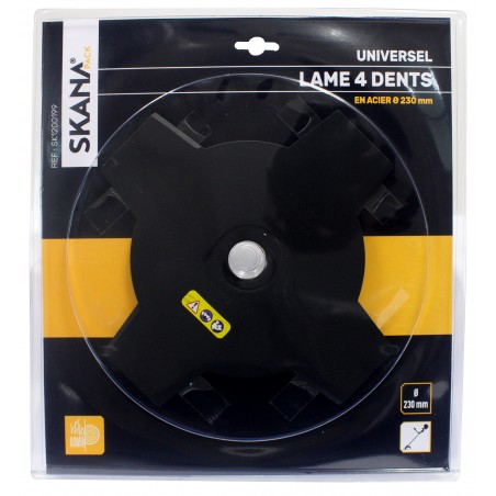 Lame en acier 4 dents Ø : 230 mm Alésage : 25,4 mm Epaisseur : 1,5 mm Pour débroussailleuses à partir de 30 cc.