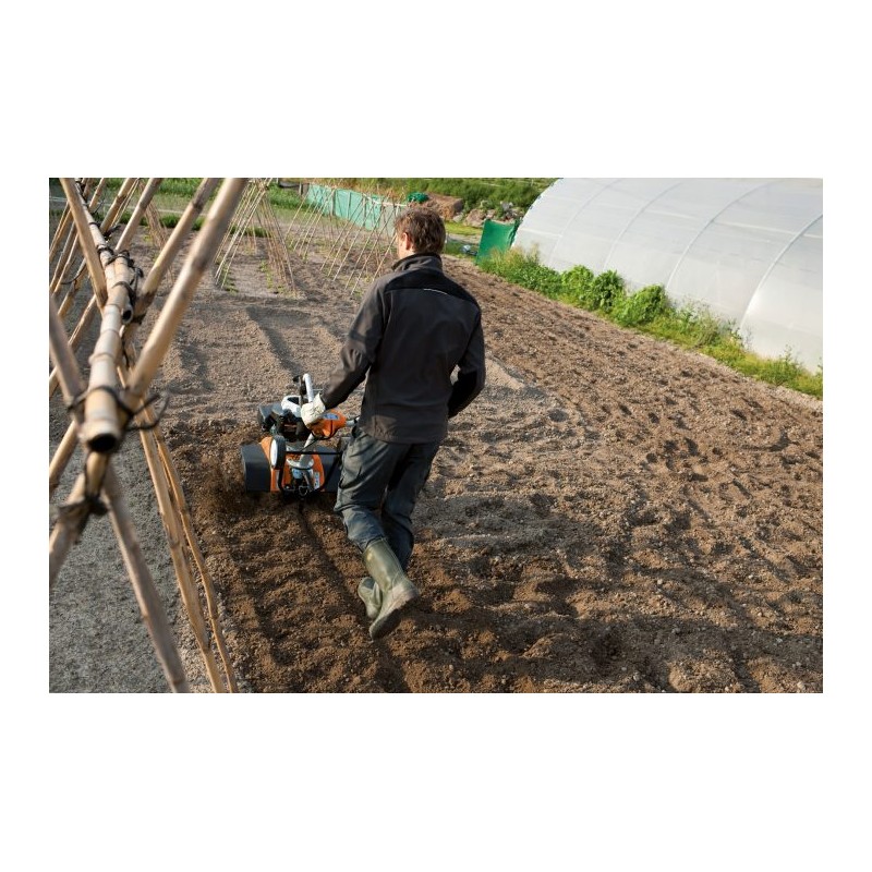 - Commande d'accélérateur simple : La motobineuse se pilote à l'aide de deux poignées, dont la commande accélérateur. Elle se trouve à portée de main pour pouvoir utiliser le régulateur de régime situé sur le guidon à l'aide du pouce pendant la conduite. Donc, lors du binage vous pouvez doser de façon précise la puissance dont vous avez besoin.