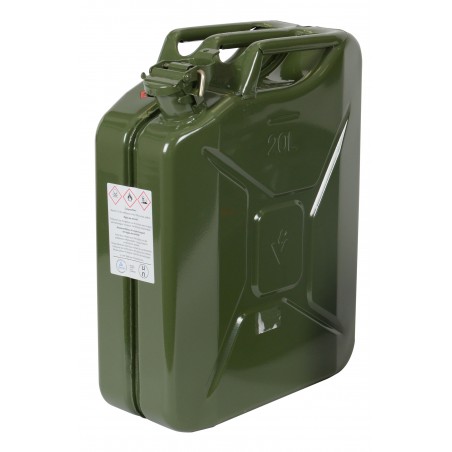 Jerrican métallique 20 litres. Peinture extérieure à la poudre couleur vert armée. Traitement intérieur antirouille et résistant à tout carburant. Système de verrouillage avec goupille de sécurité. Certifié UL et TUV.
