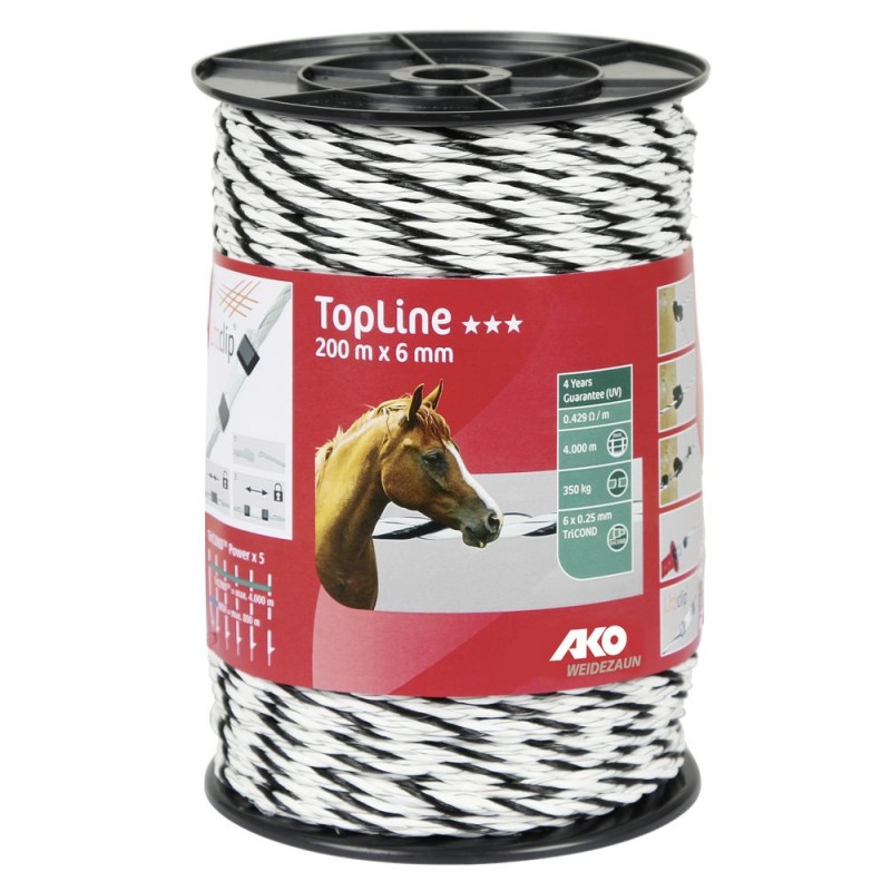Fil Topline pour clôture électrique d'une longueur de 200 m, 6 mm de diamètre, coloris blanc noir.