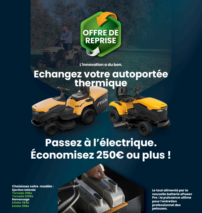 Du 1er mars au 30 septembre 2026 inclus, profitez d’une remise jusqu'à 250€, rapportez votre ancienne tondeuse autoportée (quelle que soit la marque) et achetez une nouvelle autoportée à batterie pour bénéficier de l'offre. Ces autoportées à batterie sont disponibles dans votre magasin Rural Masterrevendeur agréé STIGA.