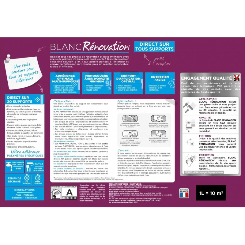 - Sur bois, béton, ciment, plâtre et dérivés : poncez légèrement, dépoussiérez, puis appliquez la Sous-couche Universelle V33.