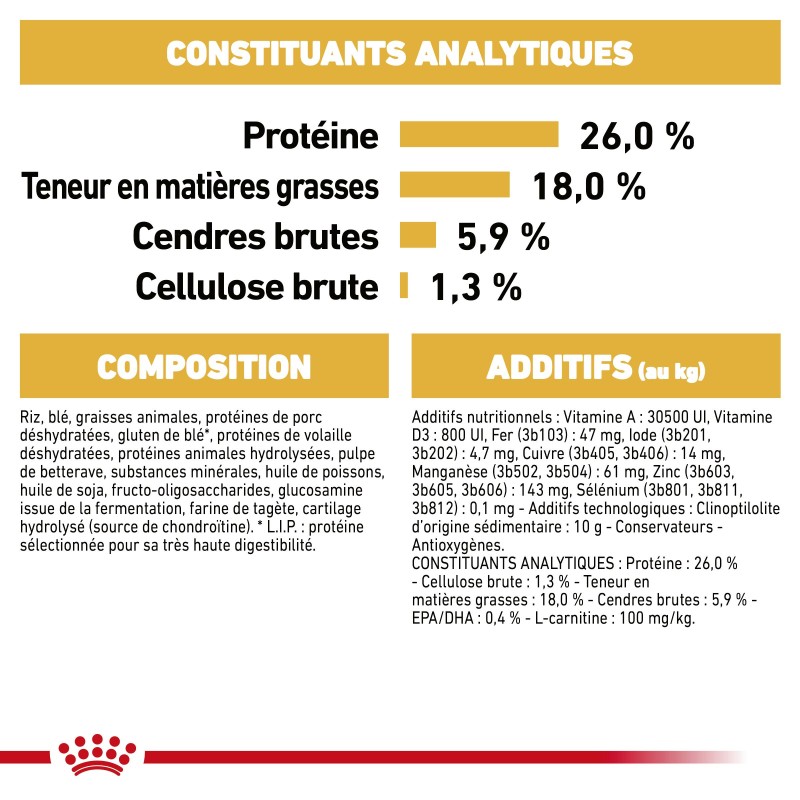 Riz, blé, graisses animales, protéines de porc déshydratées, gluten de blé*, protéines de volaille déshydratées, protéines animales hydrolysées, pulpe de betterave, substances minérales, huile de poissons, huile de soja, fructo-oligosaccharides, glucosamine issue de la fermentation, farine de tagète, cartilage hydrolysé (source de chondroïtine). *L.I.P. : protéine sélectionnée pour sa très haute digestibilité.