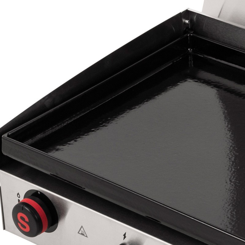 Plancha à gaz à poser en acier inoxydable, plaque de cuisson en fonte émaillée, couvercle de protection en acier inoxydable.